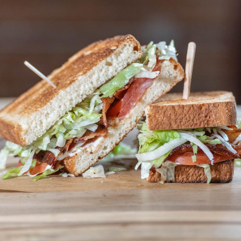 Bacon, lettuce, tomato, mayo on toasted white bread