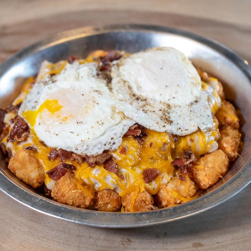 Smothered in sausage gravy, cheddar cheese, bacon & over-easy eggs