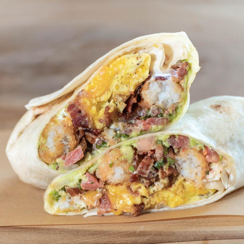 Eggs, bacon or sausage, tots, cheddar cheese, avocado, pico, sour cream, wrapped in a flour tortilla