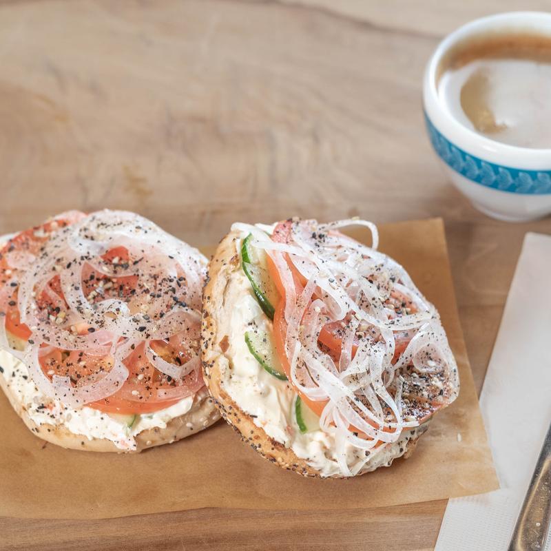 Served open-faced with cream cheese, tomato, cucumber, onion & everything bagel seasoning • Cream cheese: plain or veggie