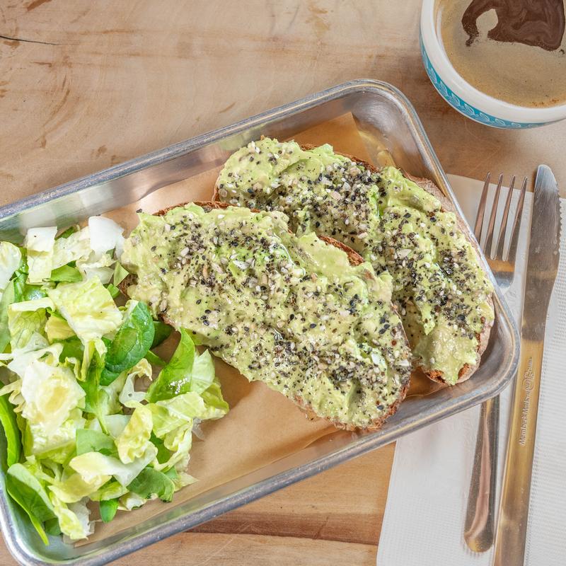 Smashed avocado on Farmer’s bread topped with everything bagel seasoning & lemon olive oil dressing served with romaine & spinach salad (dressing contains honey)