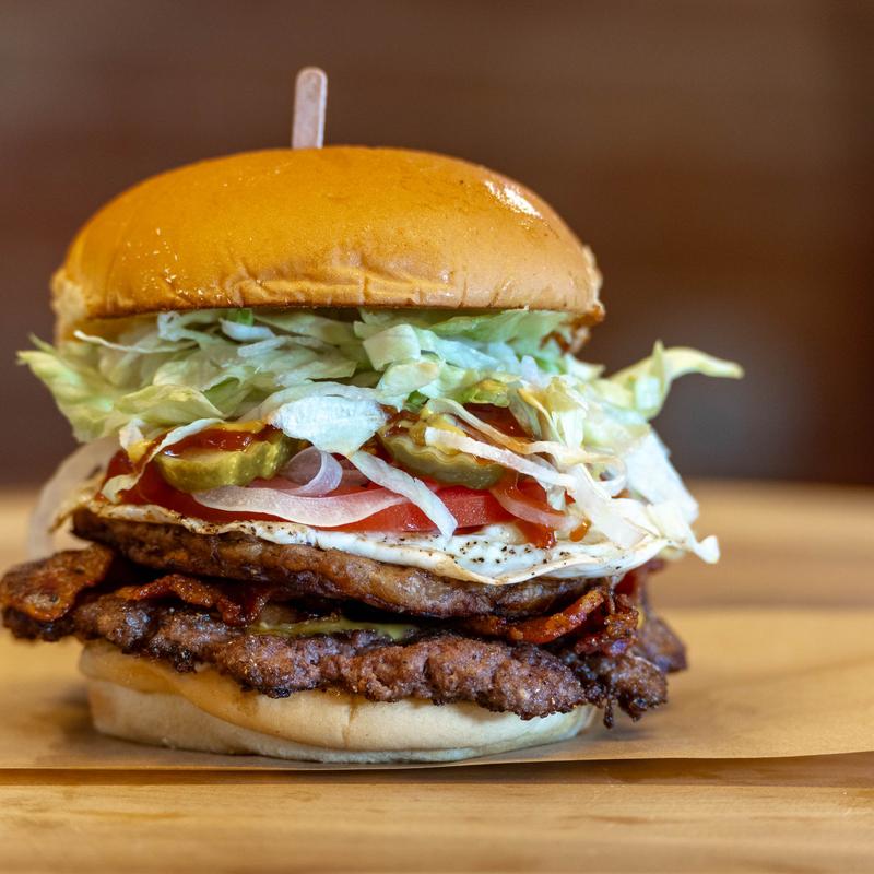 With Am. cheese, sausage, bacon, over-easy egg, LTO, pickles, ketchup, mustard & mayo