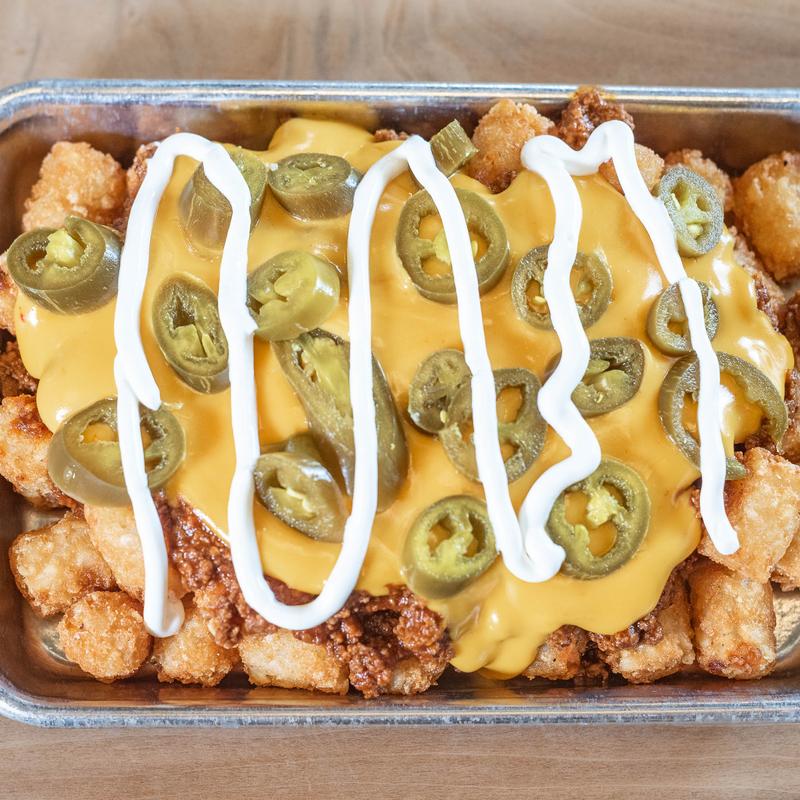 Tots with chili, nacho cheese, pickled jalapenos & sour cream