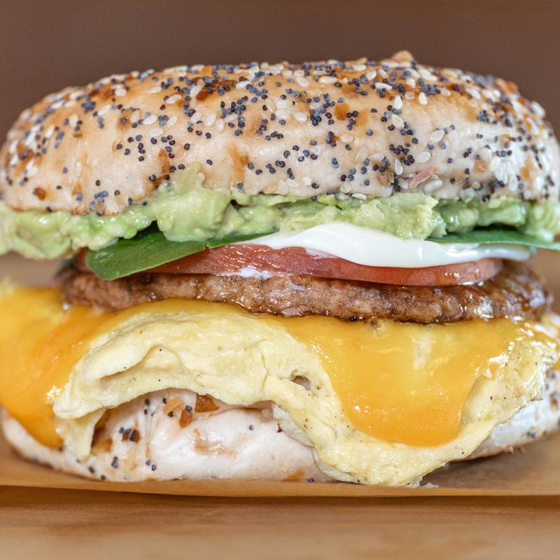 Eggs, sausage, cheddar cheese, avocado, tomato, spinach, mayo