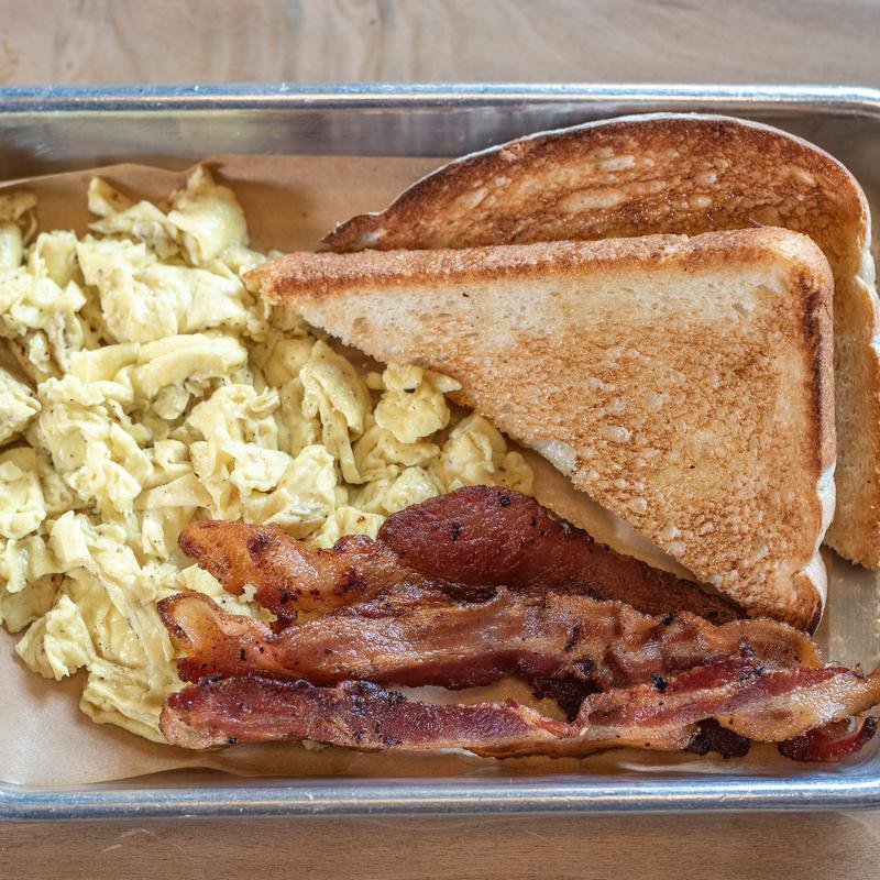 Scrambled eggs, bacon or sausage, buttered toast or a biscuit