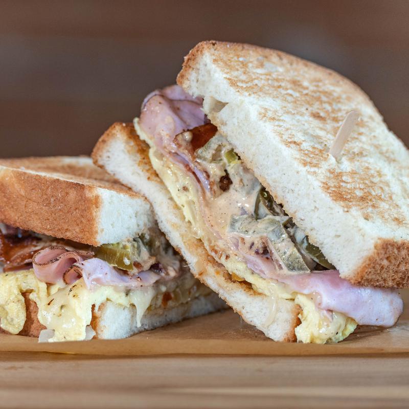 Eggs, grilled ham, bacon, grilled peppers & onions, pepperjack cheese, pickled jalapenos & Curtsy sauce